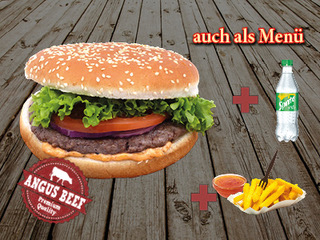Angus Beef 125 gr. , Tomaten, Zwiebeln, Salat, Burger-Sauce