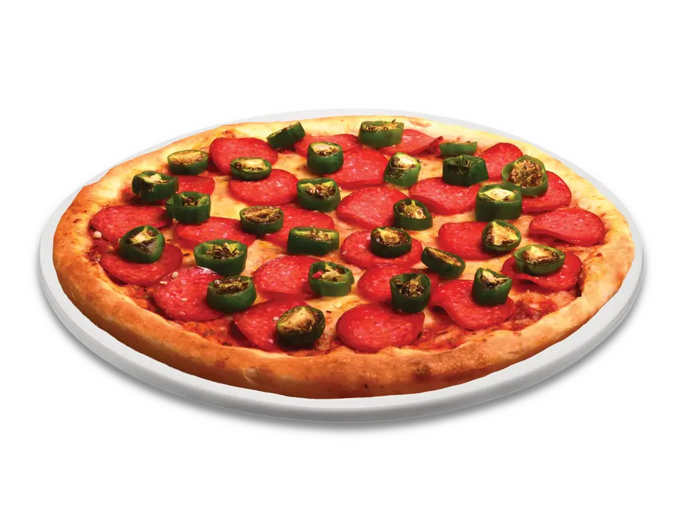 Frischer Teig, Tomatensauce, echter Käse, Peperoni-Salami, Jalapenos, Tabasco