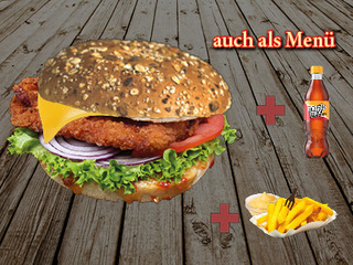 Crunchy Hähnchenfilet, Käse, Tomaten, Zwiebeln, Salat, Sweet-Chili-Sauce